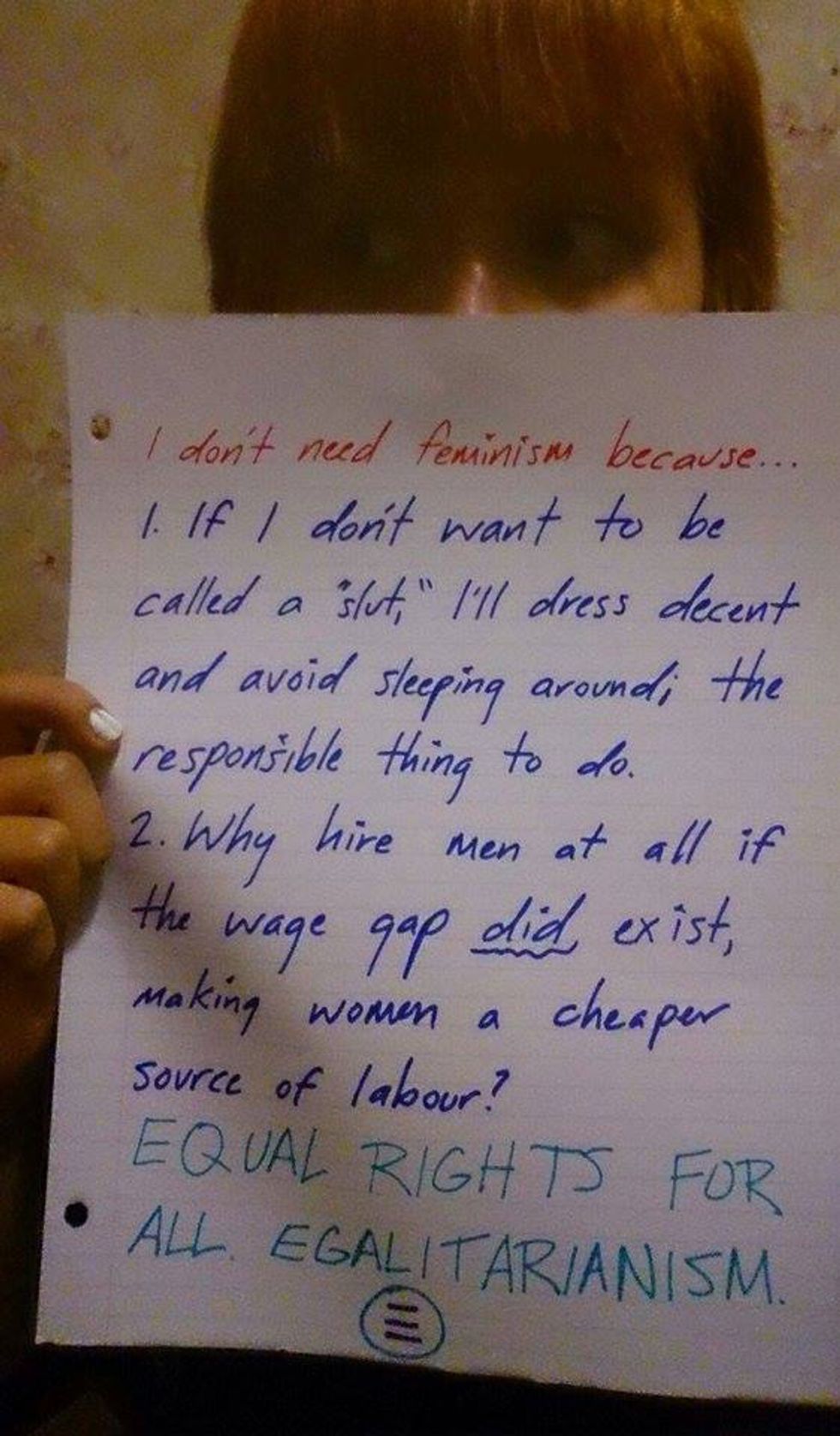 This shouldn’t be how the population perceives feminism. Feminism is about equality. At this point, feminism needs to rename itself to Egalitarianism or something that reinforces that women don’t want to enslave men and drink their tears. Feminism isn’t anti-men, it’s anti-discrimination.