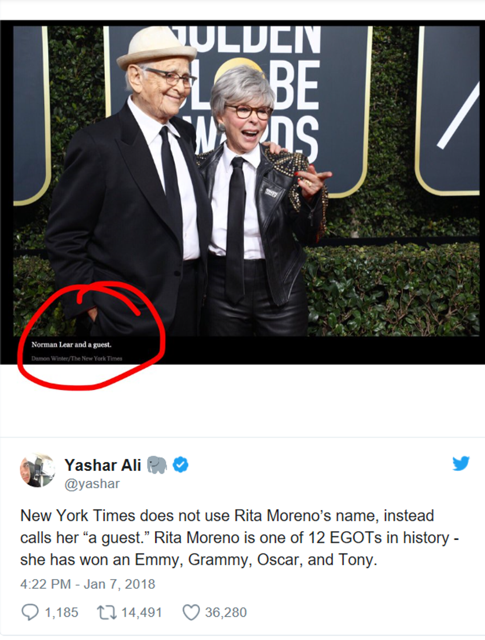 Other admirers of Rita Moreno took to social media to share their similar feelings of anger and disgust over the oversight of such an irreplaceable talent. Even Norman Lear reached out to the printing company with his own caption: "@TheRitaMoreno and guest." The New York Times has since fixed the caption stating an apology for not properly acknowledging "the wonderful Rita Moreno."