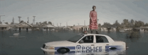 Literally drowning in symbolism, the video starts off with her straddling a NoLa squad car, half-submerged in Hurricane Katrina floodwater, followed by snapshots—all taken in New Orleans—of a changed post-Katrina world. The first words of the song, as well as the spoken interlude, are taken from a video of Messy Mya, a local New Orleans celebrity who was was brutally shot and killed in 2010, yet another shout out to end violent crime.