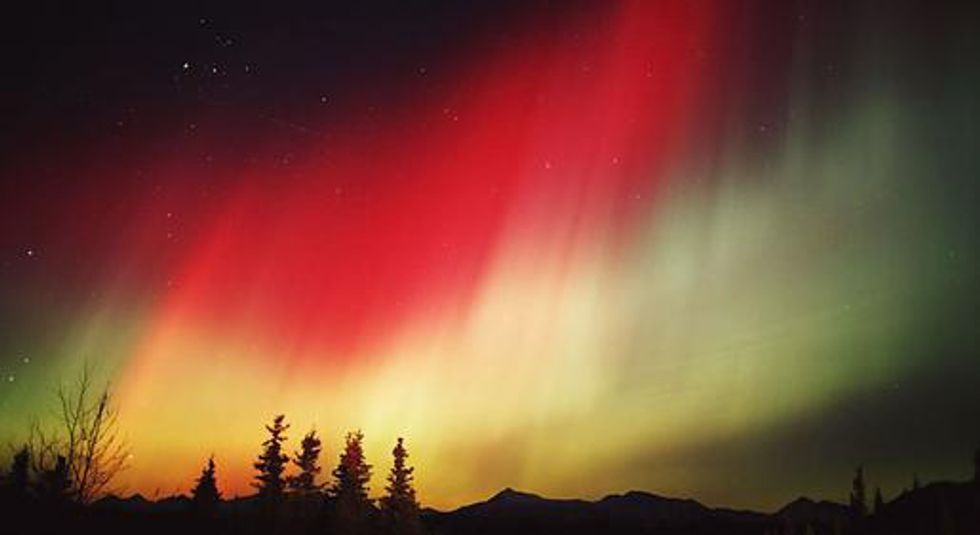 The colors and patterns of the aurora depend on the different types of ions or atoms being energized as they collide with the atmosphere and interact with the lines of magnetic force, as well as the altitude of the meeting. The colors vary from blue violet, violet red, bright green, and ruby red. The shapes differ from rippling curtains, pulsating blobs, traveling pulses, or steady glows.