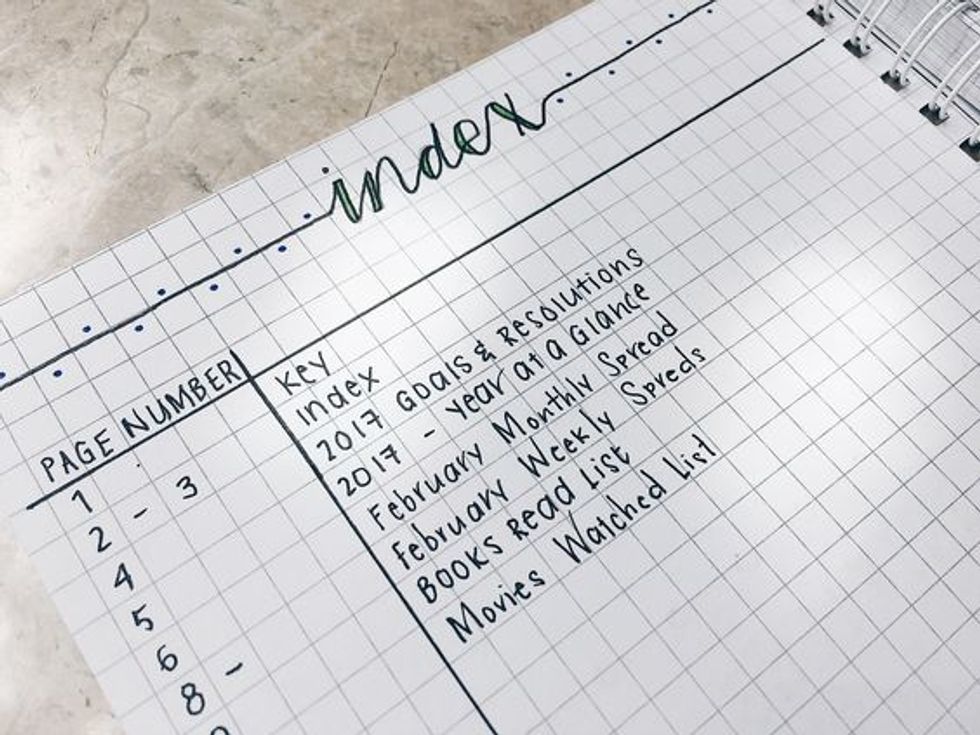 First, you'll want an index. The index is essential to keeping your journal organized. Start by creating an adorable header, then choose whichever style is fitting for you! Write out each page number and add next to it what is on that page.