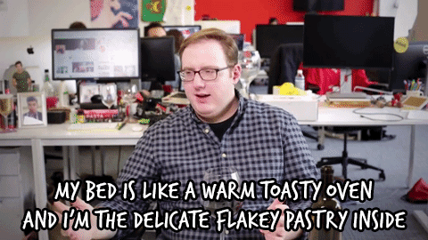 “My body isn’t ready to confront the world until I’ve had at least three cups of coffee, cereal, a nap, and lunch. Then, you can deal with me. Also, getting out of bed is already a struggle enough… My bed is like a warm toasty oven and I’m the delicate flaky pastry inside.”