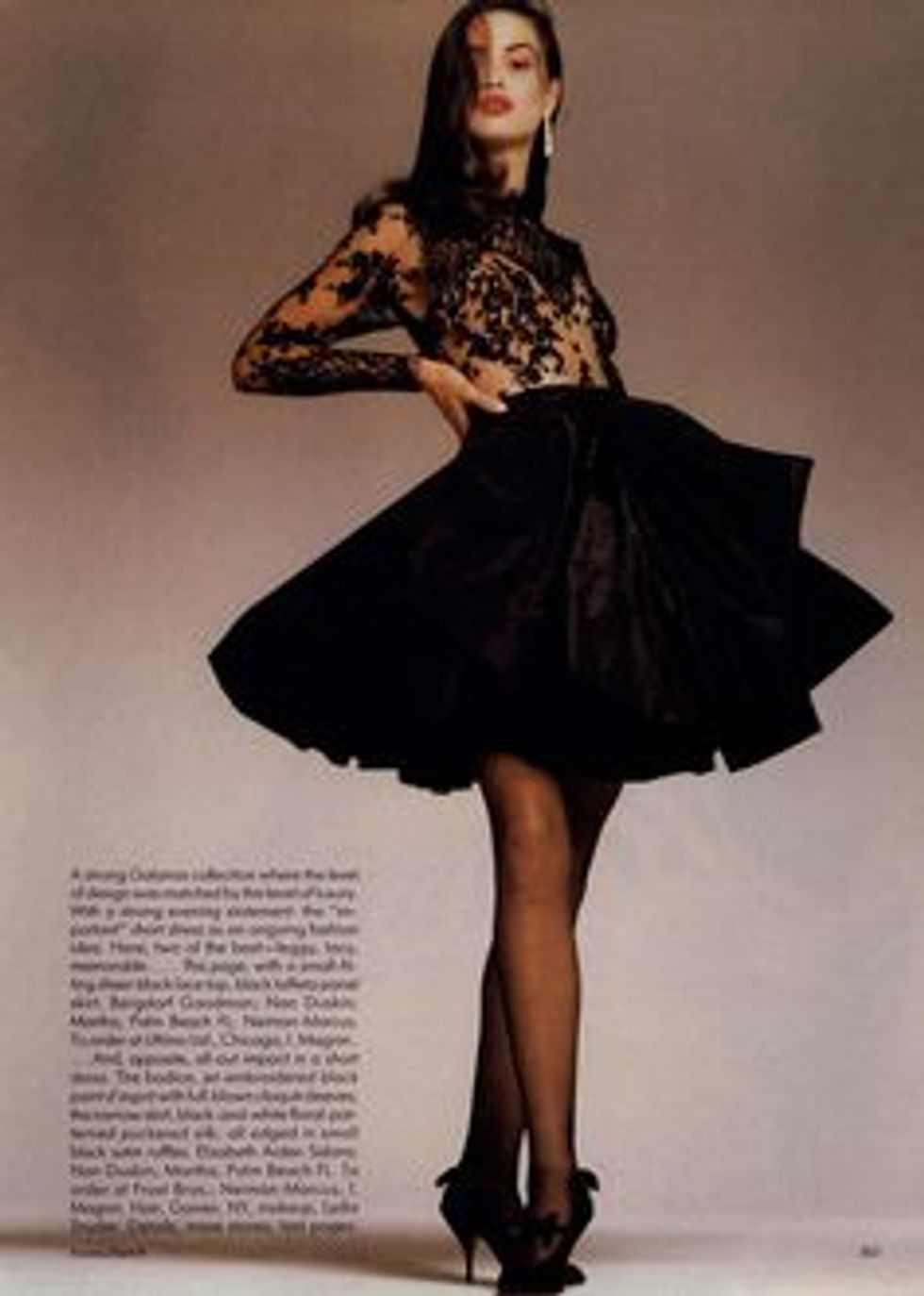This bubbly and expressive time period brought back the elegance, but also kept the edginess of the 1970's little black dress. Broad shoulders and strong embellishments such as sequins and rhinestones brought some sparkle and life to the LBD. The dresses were dazzling with their playful frills and spreading layers, and designers put their imagination into making products that were innocent, but also sexy. Icons such as Madonna kept the styles of punk alive, continuing the trend of ripping, pinning, and wearing of clothing. In a way, this symbolized not only the youth of the generation, but also the freedom in which they were searching for. Very much like the women who turned to the LBD in the 1920's.