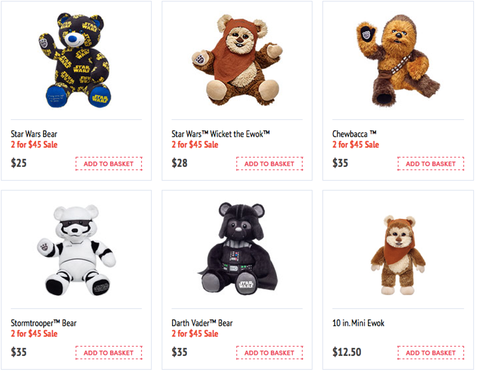 Ewoks aren’t the only "Star Wars" character that Build-a-Bear offers. They offer characters such as Chewbacca, Darth Vader, BB-8, and a Storm Trooper Bear. They also have many "Star Wars" costumes for sale including outfits that resemble Rey, Finn, Leia, Kylo Ren, Poe Dameron, Boba Fett, Han Solo, R2-D2, and many more!