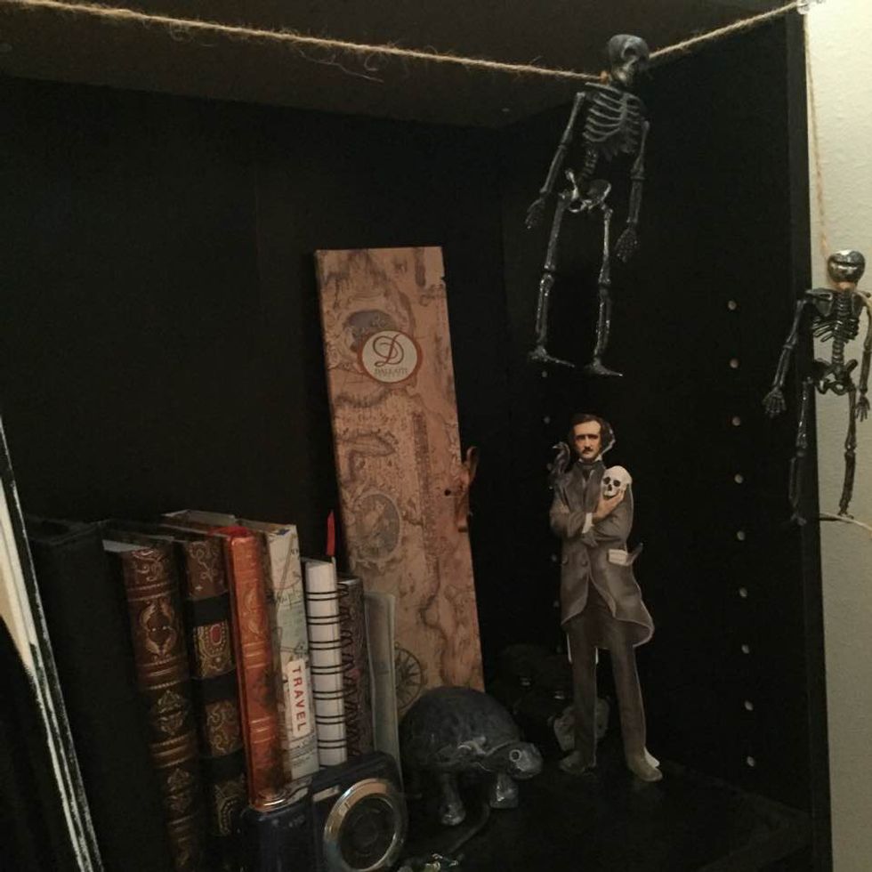 This is where a dead man conspires with a ceramic tortoise, an inkwell beside them. Plastic skeletons hang on frayed ropes tied to the corners. I watch the towers lean. Two inches to the left.