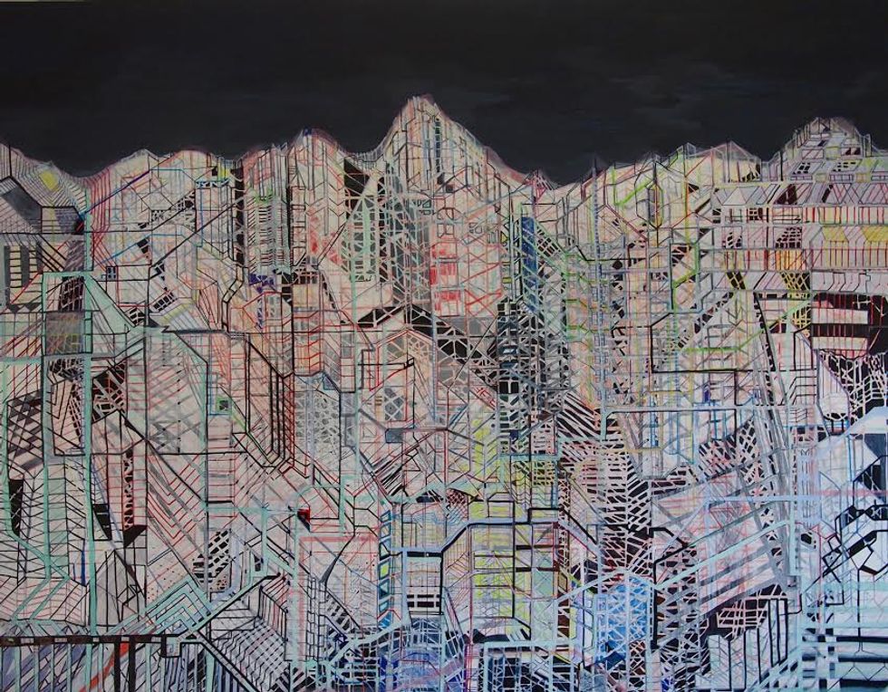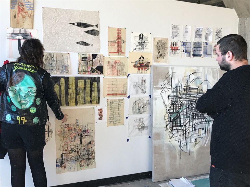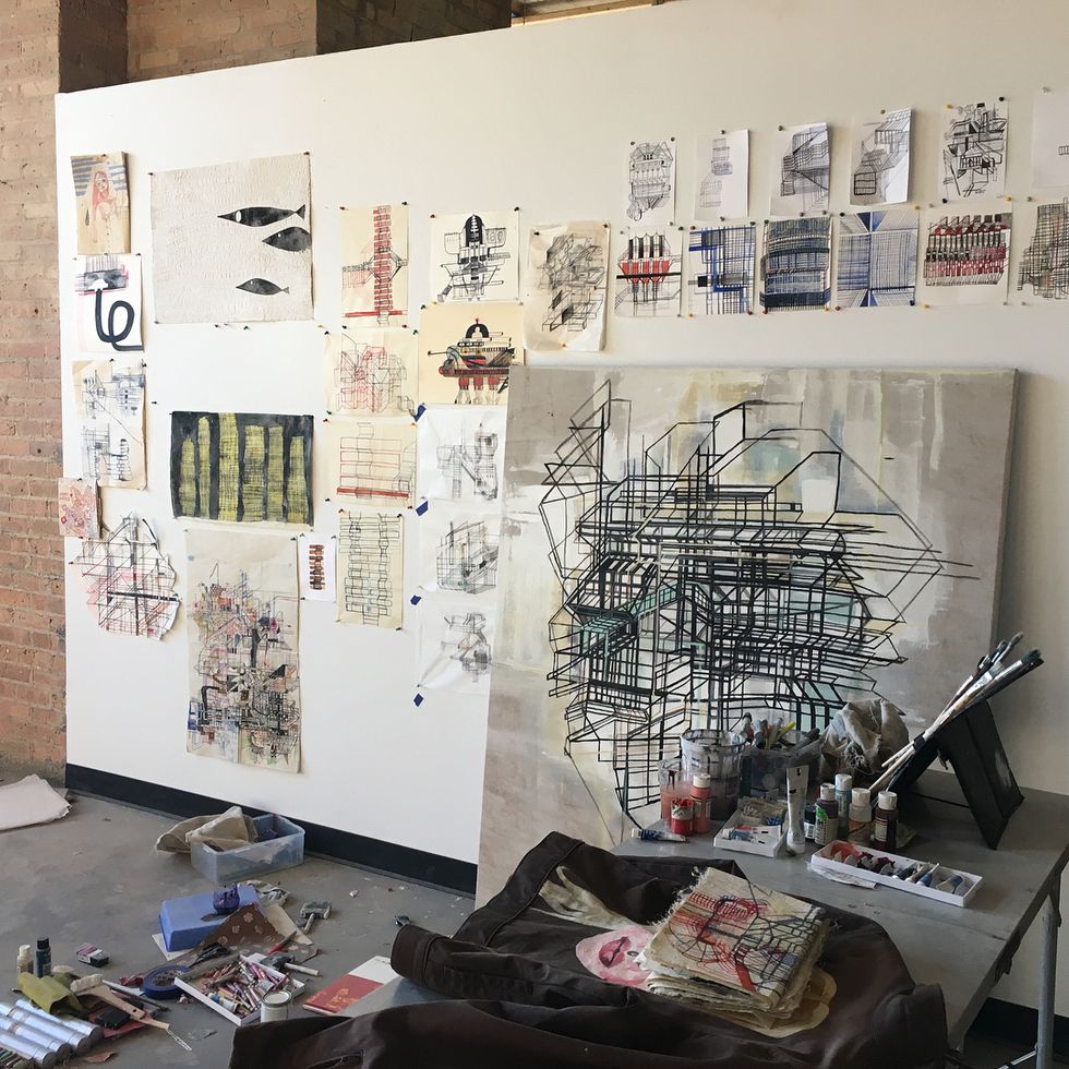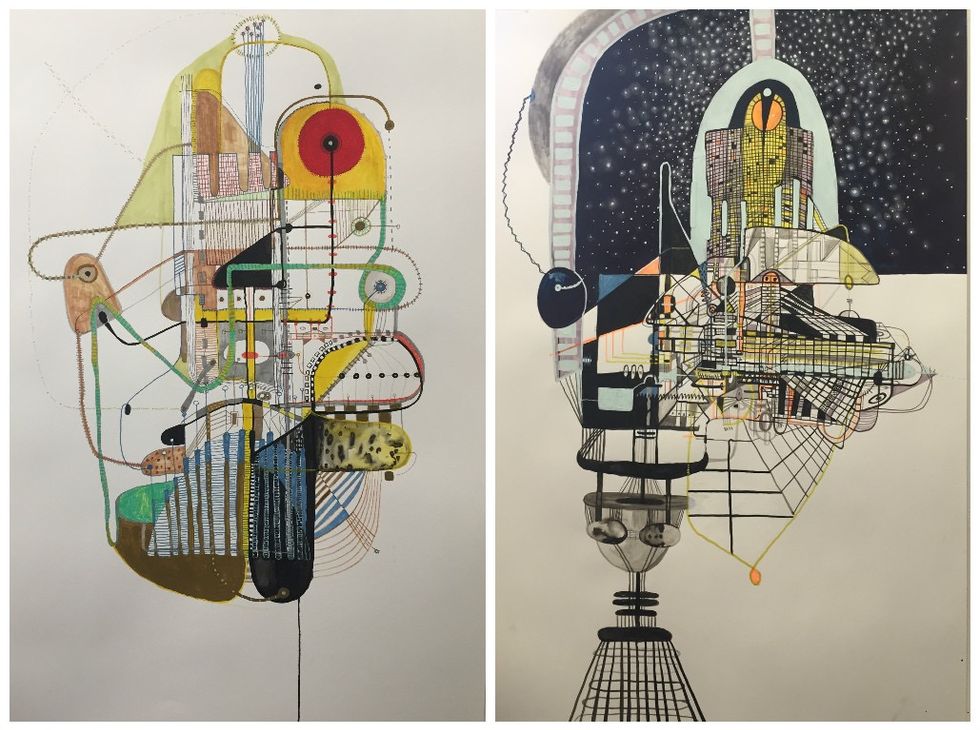 As one can see in the photographs from our studio visit, Dain works out many of her ideas on paper, using multimedia processes. She drafts works in ink, pencil, and paint, creating layers of organic shapes built into grids and mechanized forms. Each detail seems to be assigned a function for the viewer to determine, bringing to life these futuristic abstractions.