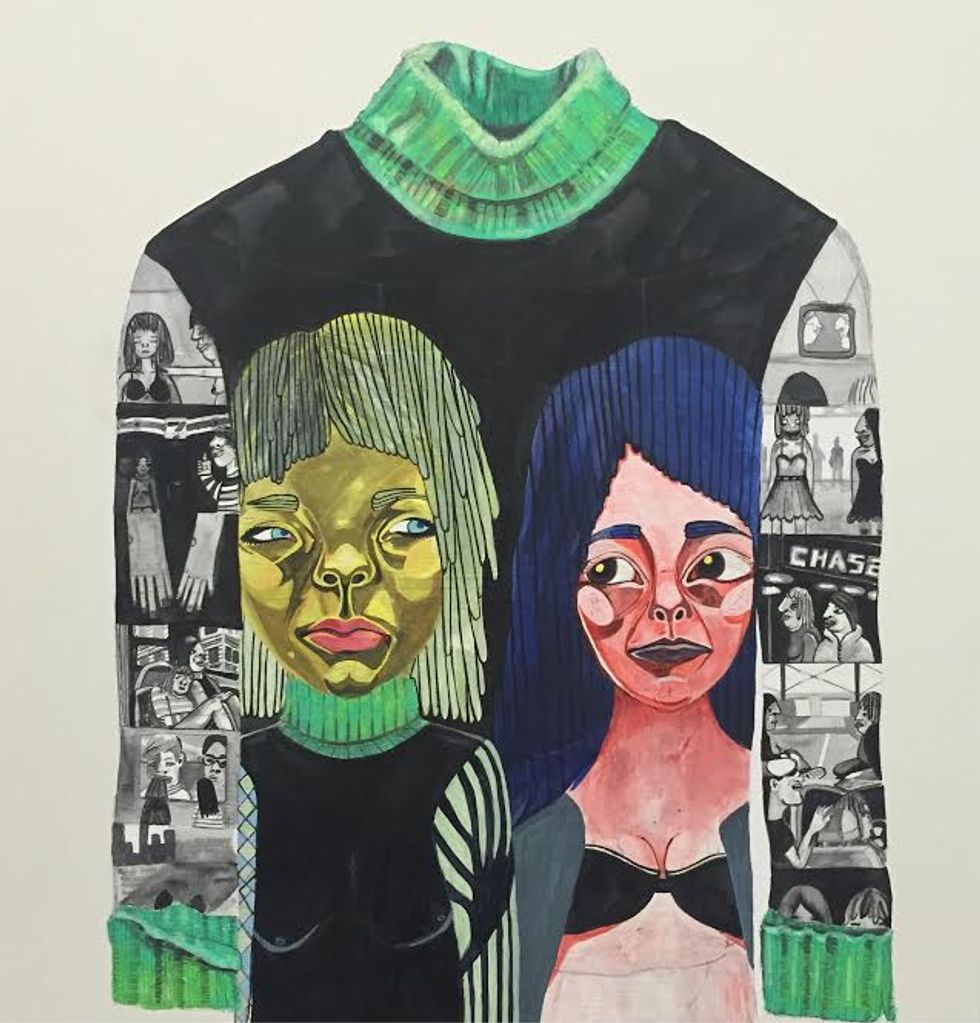She looks, in particular, at the way people decorate themselves and 'perform' for others. The intention behind her collection of drawings and paintings is to illustrate the invisible and intuitive self. As well as expose the identity and personality of the objects we wear. Her pieces argue, by honoring imagination anyone can transform the mundane into something magical.