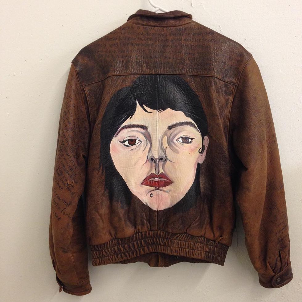 Another body of work focuses on identity through the creation and customization of personal belongings. This series includes painted leather jackets, sweaters, shirts, jean jackets, suede jackets and panel paintings depicting these art objects. Many of these custom painted articles of clothing feature portraits of individual faces in resting position, not expressing a clear emotion, but depicting a natural reflection of the face most individuals wear as they go about their day.