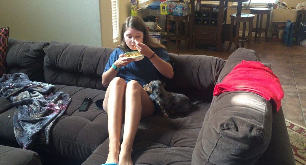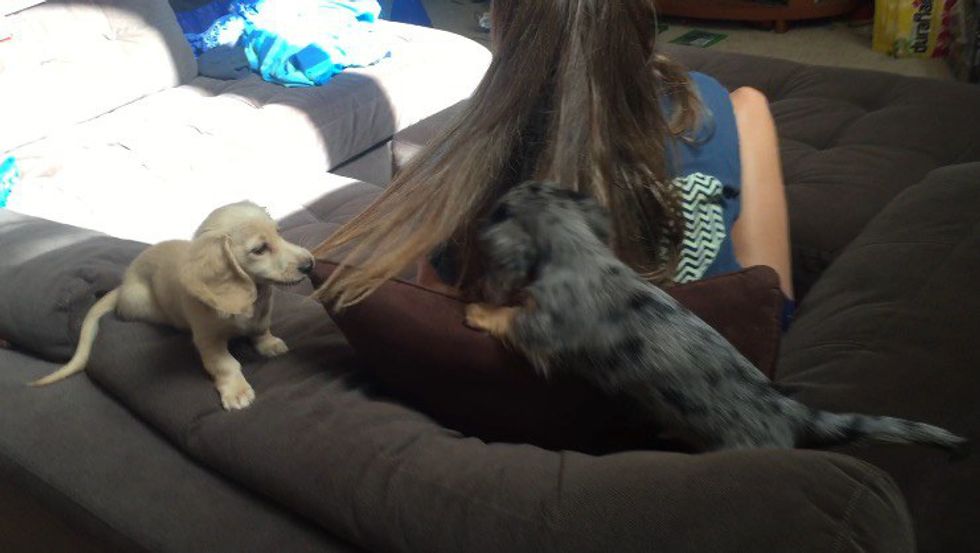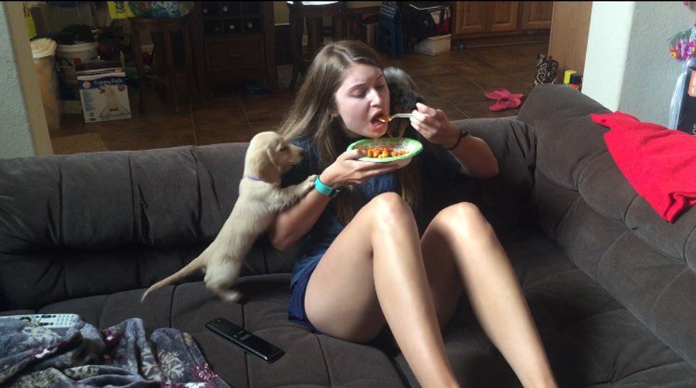 Reality- My puppies do not cry whenever I am eating because that would be too easy. Instead, they decide to attack me.