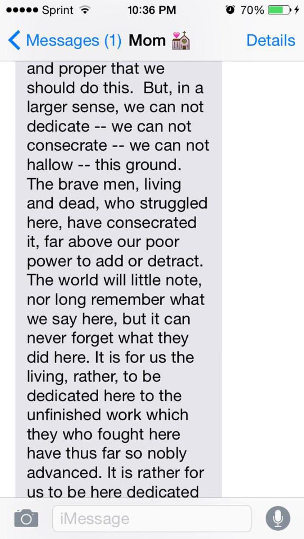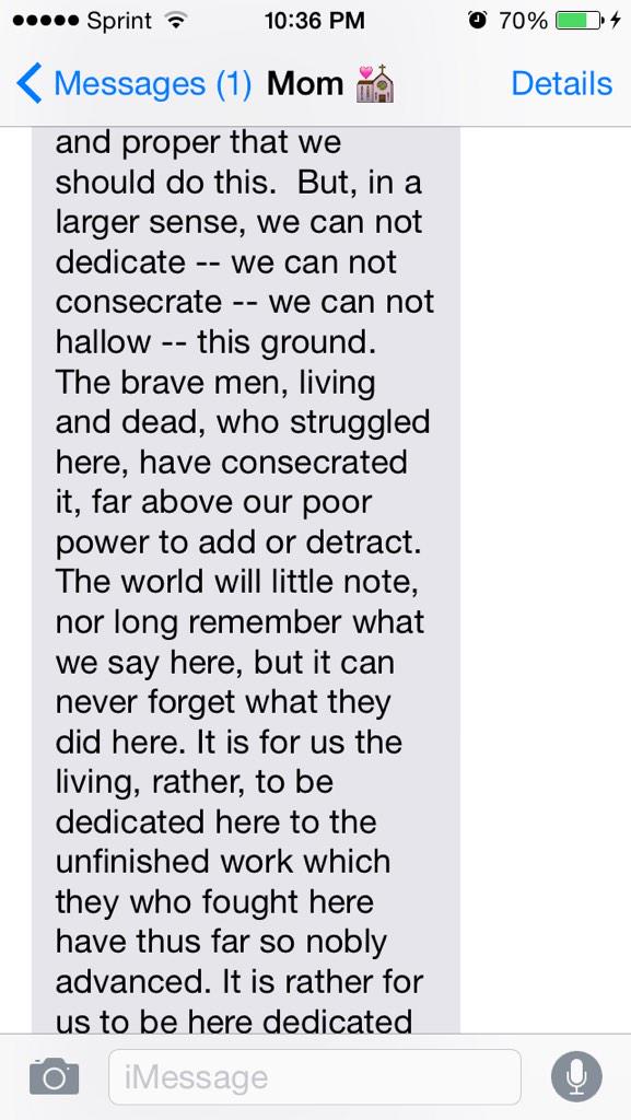 You post a picture of a screenshot of texts between your mom and you. You changed, “Yeah,” in her phone to Abraham Lincoln's "Gettysburg Address."
