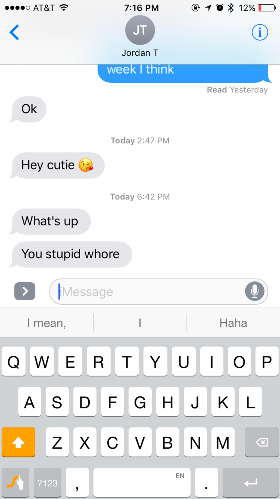 Anyway, as the day went on, he texted me a few more times, and I continued to ignore the texts. At that point, things took a pretty awful turn. He began to call me all sorts of awful names for ignoring him. At one point, he called me a whore, which I find a bit ironic considering his problem was that I was choosing not to sleep with him.