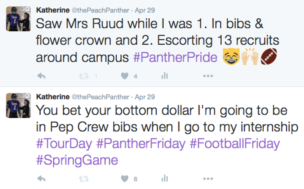 And there was one time, the day of the Spring Game, where I got to go around campus with probably 13 recruits and their families in gameday bibs (because, as a Pep Crew exec, I was promoting the Panther Pep Crew). And on the way back to the Dome we ran into the president of the university's wife.