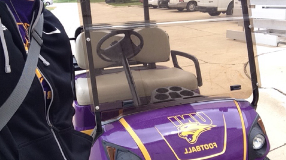 Until then, we get to drive and ride around in the official UNI Football golf cart.