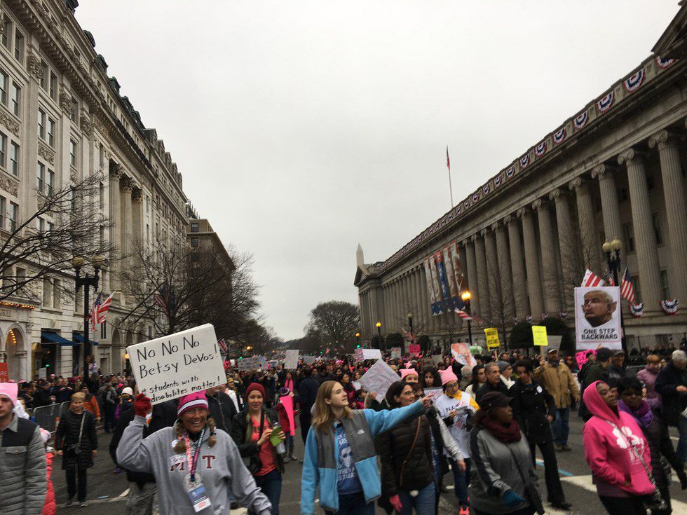At one point during a slight upward incline, it didn’t seem like there were too many people around me. I turned around to witness a sight that still renders me speechless: hundreds of thousands of women behind me, with the Washington Monument at the very end. That’s when I fully understood what this unique, unprecedented sisterhood was about. All of these people literally and metaphorically were behind me. They supported my goals and dreams, and they let me know that I will not fight alone.