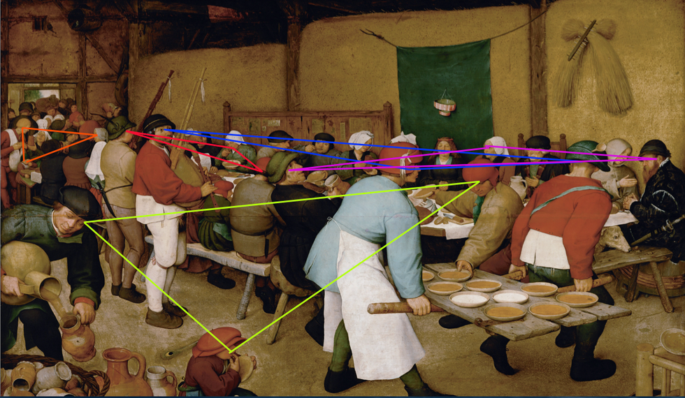 Unfortunately, very little is known about Bruegel’s life, aside from what we can conclude from the works that he created. Looking through the book The Drawings and Prints of Bruegel, it is clear that organization and symbology has been very key throughout all of the art he created, and that includes The Peasant Wedding (Orenstein, whole book). The Peasant Wedding’s composition is exquisitely balanced, and the space is realistically shown. Using figures receding towards the door in the back left of the scene as a reference for the space, Bruegel slowly adds in shapes using the gazes of each person; there are several instances in which the direction of the gaze of three people follow one another and create triangles throughout the composition; this placement of geometric shapes through gestures was no accident, and serves as an example of the unity and harmony that Bruegel tries to achieve between the subject and environment (See Fig. 2). This strict organization is then followed by adding meaning, or in this case significance, to each person’s gesture. The boy in the front left corner of the frame has his finger in his mouth, a plate in his other hand, and bread on his lap; this is suggestive of limited indulgence. Licking his fingers, the boy seems to be enjoying every last morsel of what he is given.