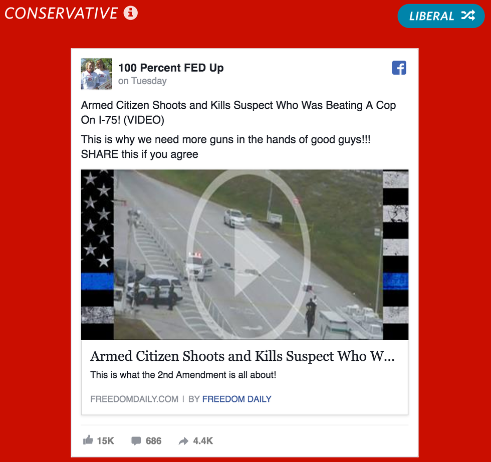 This is where Snowden really buckles down on his main point: Facebook cannot be your only source of news. By reading news from several sources, it becomes easier to compare what is real to what is fake. Also, it is important to remember that Facebook works to feed us exactly what we want to hear based on our likes, interests, political views, age, etc. The Wall Street Journal released an article where you can see this for yourself. They show side by side Facebook feeds of Liberals and Conservatives. Just this little bit of information changes the types of articles we come across (in addition to the fact that Liberals tend to befriend liberals and conservatives, conservatives).
