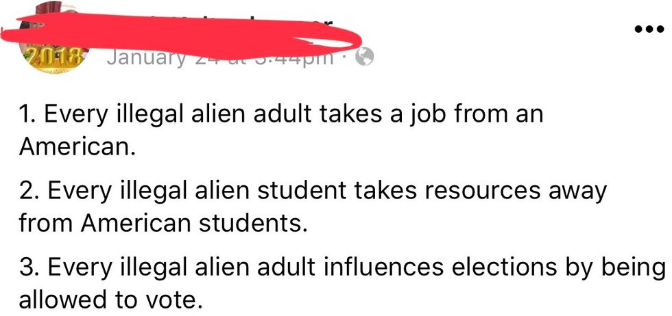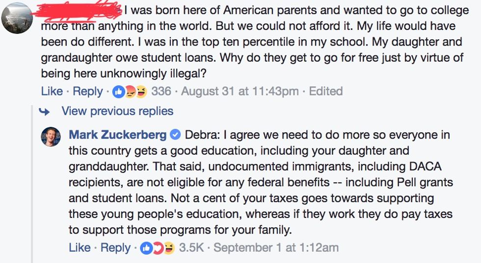6. “I was born here of American parents and wanted to go to college more than anything in the world. But we could not afford it -- My daughter and grandaughter owe student loans. Why do they get to go for free just by the virtue of being here unknowingly illegal?”