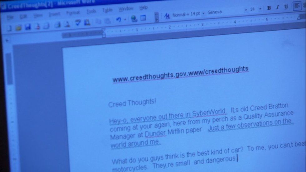 Ever wonder what Creed thinks in a day? Look no further. Creed writes his own blog www.creedthoughts.gov.www\creedthoughts. However, Ryan revealed that it is just a Microsoft Word document that he set up to make Creed believe that he actually has a blog for his thoughts. He then explains that this was done to "protect the world from Creed's brain." Wait, protect us from what?