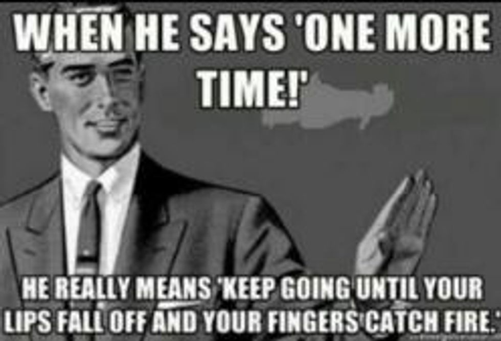 Band directors are notorious for saying "let's run it one more time" when they really run it five or six more times. So when you hear that phrase said for the first time, don't believe it. Rarely ever do you do it only one more time.