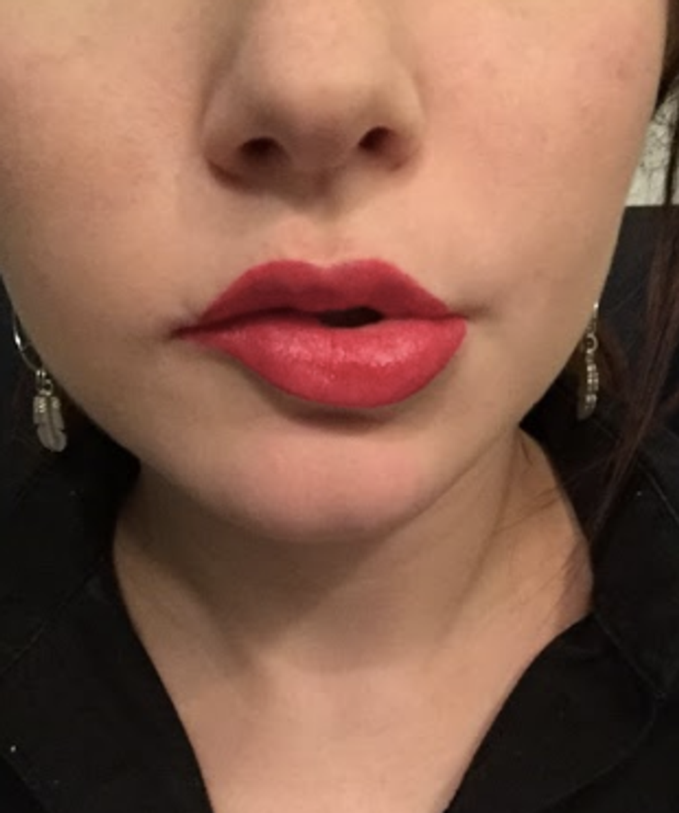 As you can see, this red lip does not wear well on its own. I purchased it on a whim at Sally's and rarely wear it because the color is not very pigmented so it appears splotchy. It also has more of a hot pink undertone that I'm not a huge fan of on fair skin.