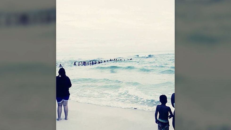 Eventually, about 80 people joined to make a large human chain that reached the family. The rescuers pulled the swimmers along the chain and brought them safely to dry land.