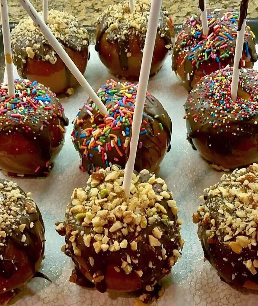 So easy to make and fun to decorate! All you have to do is buy caramel sauce, apples, and toppings. Suggested list of toppings: sprinkles, peanuts, toffee pieces, graham cracker crumbs, Oreo's, m&ms, Reese's pieces, chocolate chips, and chocolate sauce drizzle. No recipe needed.