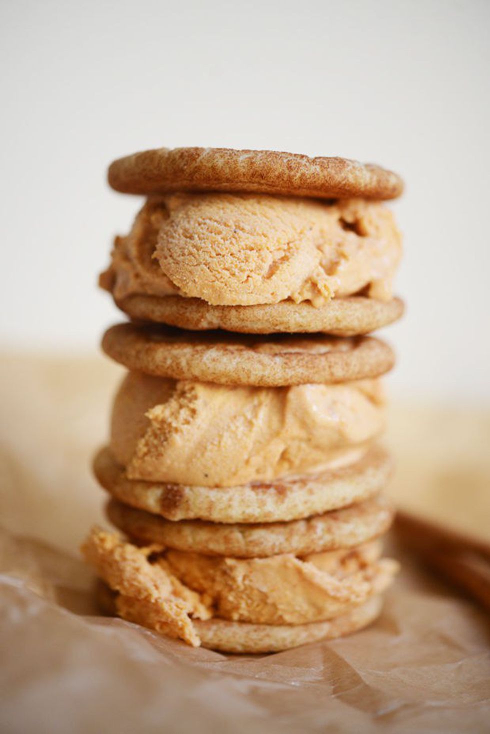 Follow the recipe for pumpkin spice ice cream, then make a sandwich with your favorite cookies. My favorite combo is snickerdoodle cookies with pumpkin ice cream.