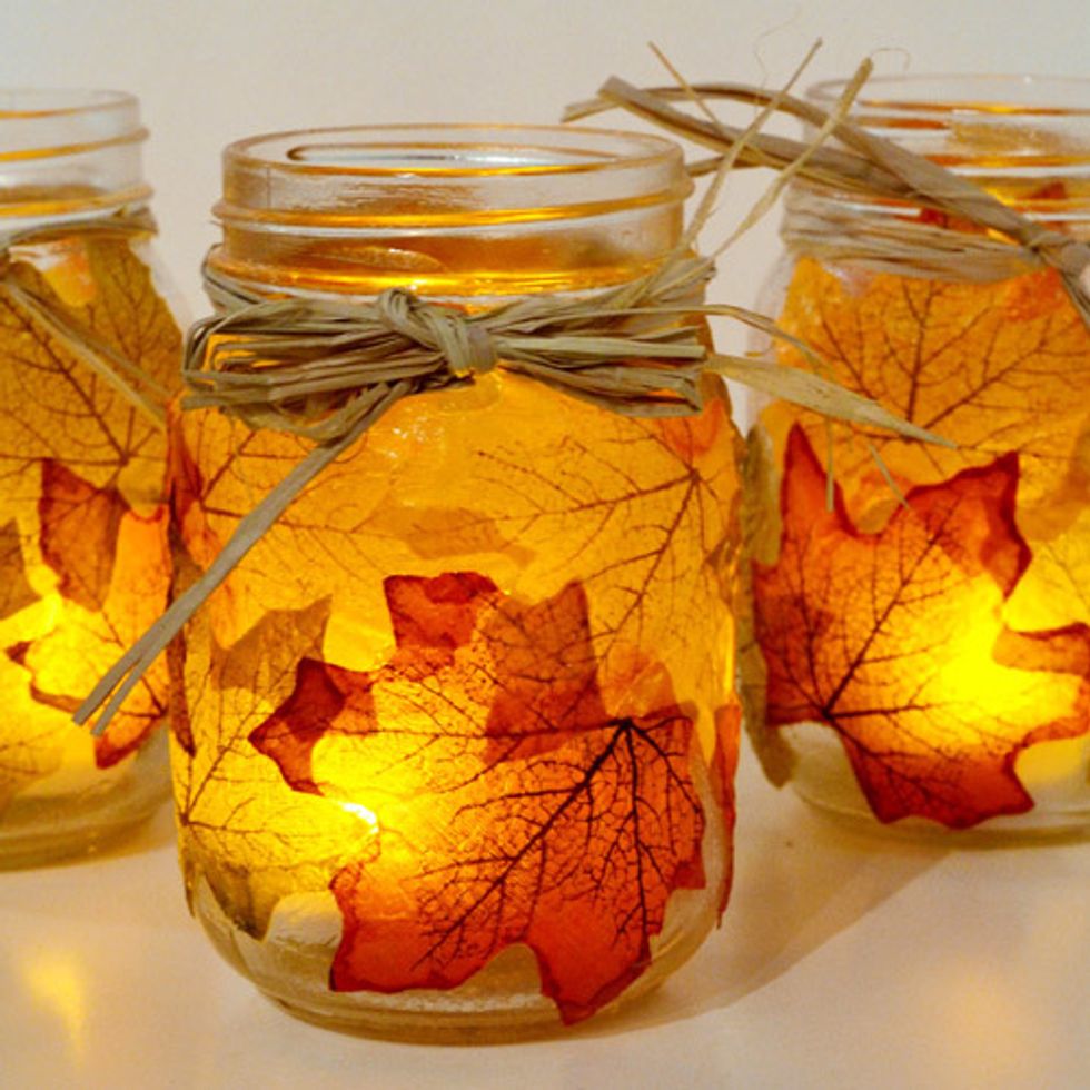 For this, all you need is bailing twine, mason jars, leaves (real or fake), Modpoge, and tea candles. These are perfect for adding to a desk or window sill. Check out the tutorial here.