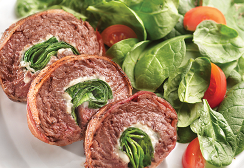 6.) Evenly spread the stuffing across the steak on one side. Roll the steak up and then put toothpicks across the roll up to make sure it does not open when in over.