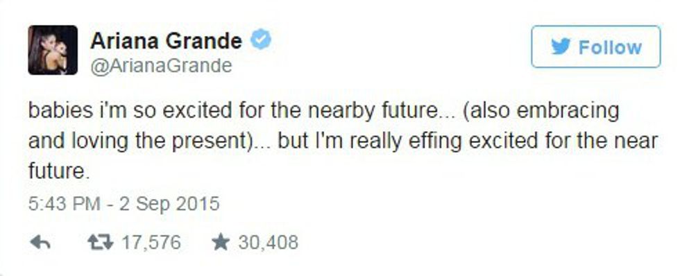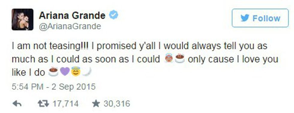 Okay guys, it has been a whole entire year since Ariana Grande has released an album. Now, of course being one of the biggest pop stars in the world means having a tremendously busy schedule (interviews, tours, trips to the doughnut shop). But c'mon man, I'M TIRED OF WAITING! Thankfully Grande took to Twitter to satisfy the world's hunger for new music. On Wednesday, the "Love Me Harder" singer, tweeted some details about her new upcoming album entitled "Moonlight."