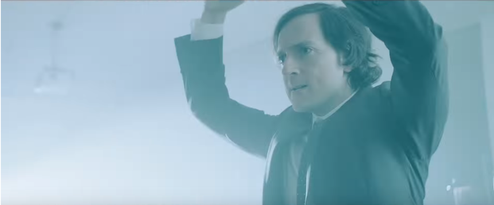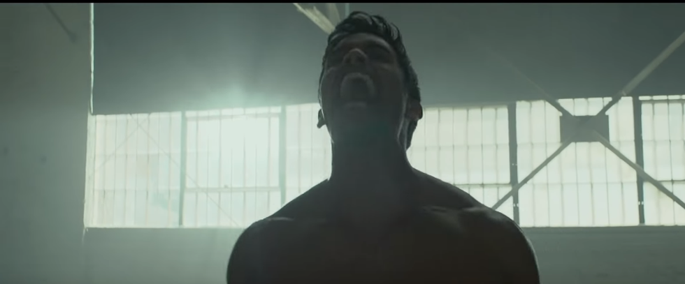 The first example we see is a man who is fighting with another man and he wins. He lets out a scream of victory, but then he takes the VR Headset and he's a completely different guy who is off to a business meeting.