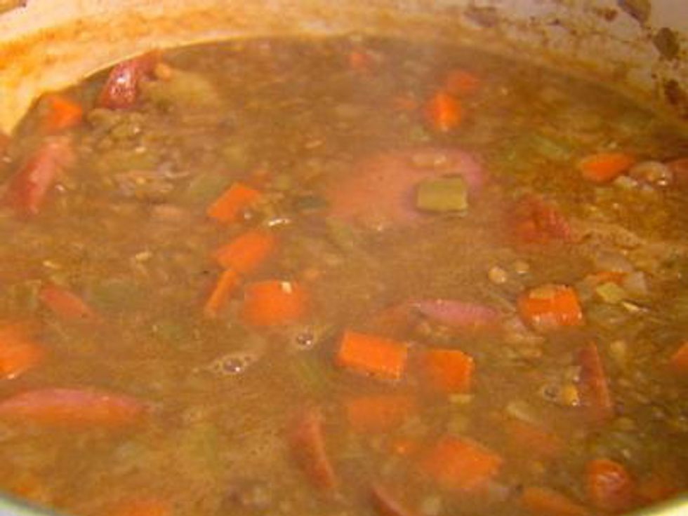 The above photo does not do this soup justice. My mom made up her own recipe for sausage and lentil soup from this restaurant in town, but this recipe comes very close. Instead of kielbasa, we crumble up spicy Italian sausage.