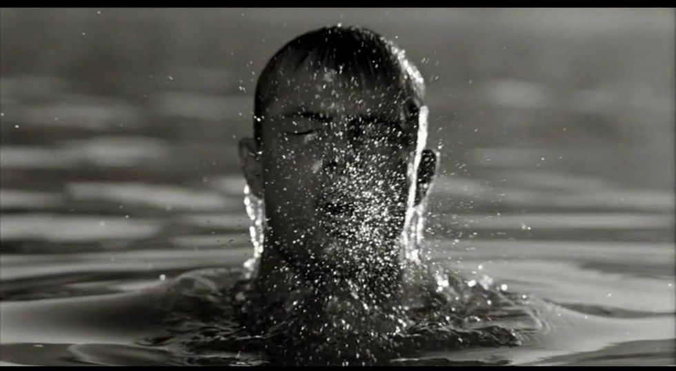 The opening shot is a black and white scene of water, there is no sound. Suddenly a man appears on the surface as Beethoven's Symphony No. 7 in A Major, Op. 92: II. Allegretto starts playing.