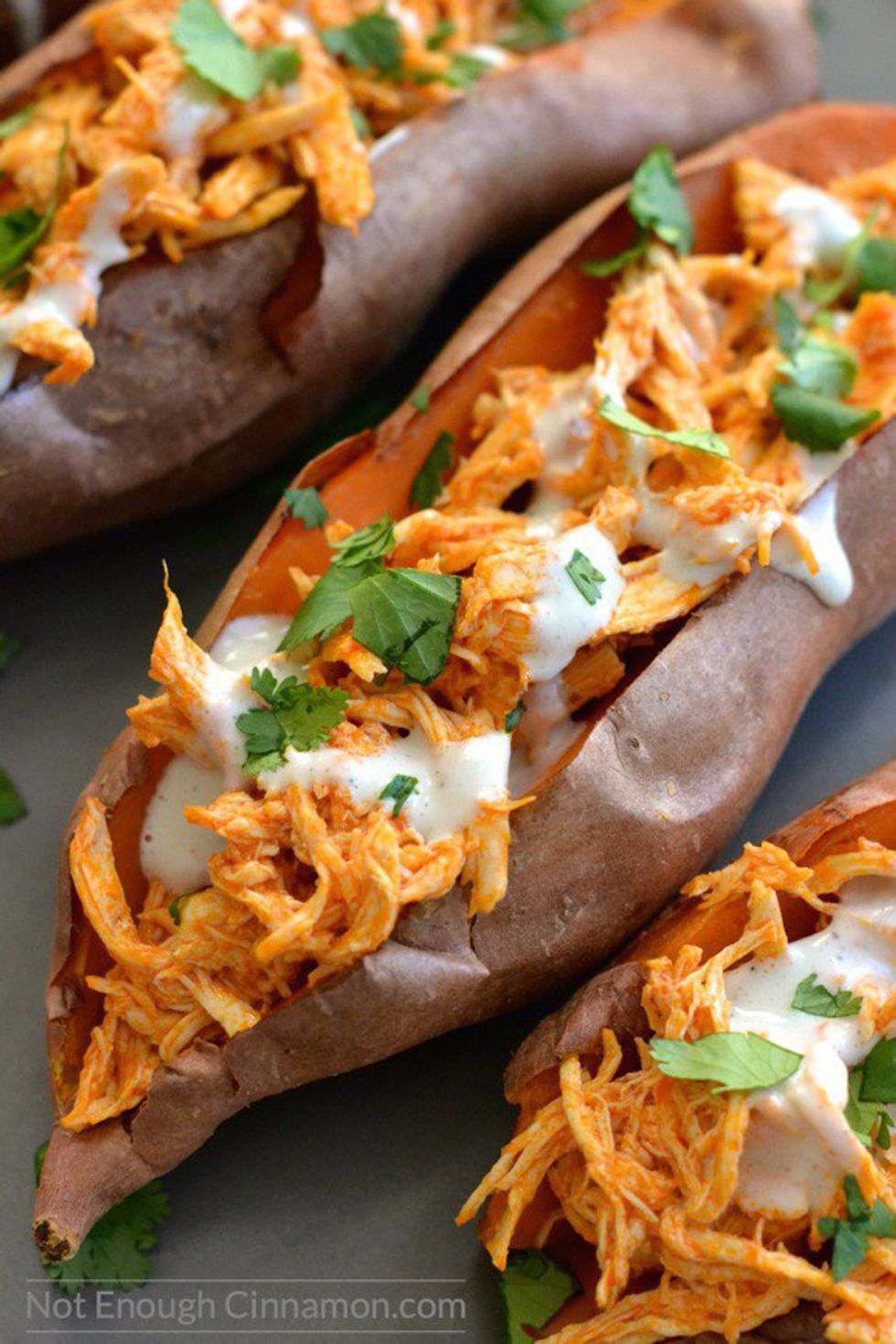1. Skinny Buffalo Chicken Stuffed Sweet Potatoes