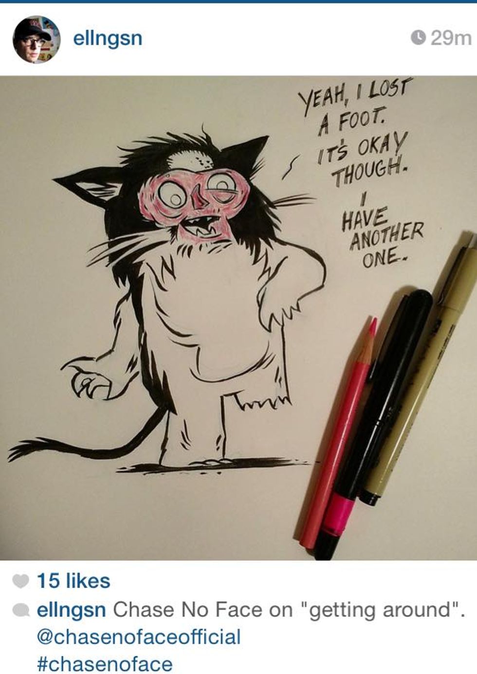 Chase's Facebook page can be accessed at https://www.facebook.com/ChaseNoFace/, and you can support Chase (who requires eye drops to keep her eyes moist), by purchasing one of her shirts at http://ellingson.cc/news/2015/4/21/chase-no-face-t-shirts.