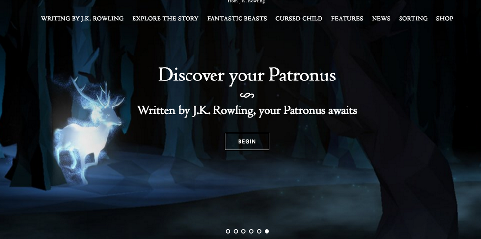 The Pottermore homepage, including a link to a quiz to determine your Patronus- I decided I think the quiz isn't detailed enough for a true answer. In the top lefthand corner, you can see the #1 source of new information about the Harry Potter world- new writing by J.K. Rowling herself.