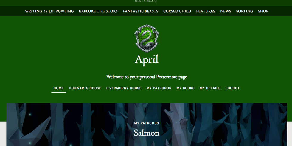 My Pottermore homepage- I am an ardent believer in the fact that Slytherin isn't a bad house, a fact that J.K. Rowling has canonically confirmed- a canon addition that I can get behind.