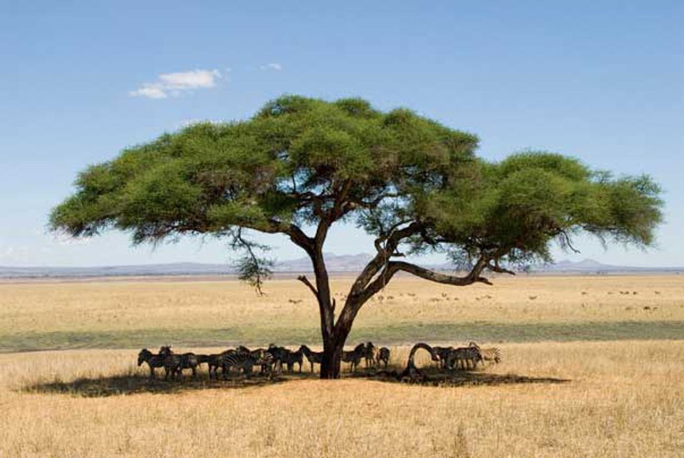 Acacia Tortilis, commonly known as an Umbrella Tree can be found on the plains of Africa. The branches are protected with lines of straight and hooked thorns to deter animals from its canopy and provide birds with a guarded nest. These trees are extremely drought resistant and well adapted to the summer heat.