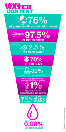Fresh water is not a renewable resource and as the chart shows below, most of the fresh water that is not ice or contaminated is used for irrigation and industries like the textile industry. Even the water you use to wash your clothing taps into the planet's limited clean water supply. One load of laundry uses about 40 gallons of water.