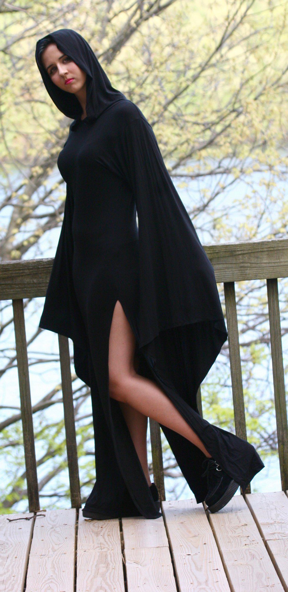 I feel like I'm about to go into the deep woods and participate in a ritual when wearing this dress with the hood up. I actually purchased this dress with the idea that I would use it in a music video in the following weeks. What I love about it is how soft it is, how it looks on me and that I can shut out the world (and not see anything) by pulling the hood up all the way. The things that are bad about this dress are the fact that the long, dangling sleeves will get stuck in car doors, backpack straps, tables and just about anything if you're not careful. This is definitely a dress you have to be careful in when wearing for fear of being yanked back and tearing the fabric. Another grievance is that you will step, sit and get tangled in the ends of the dress as you're walking. The comfort of the dress and style outweigh the minor annoyances.
