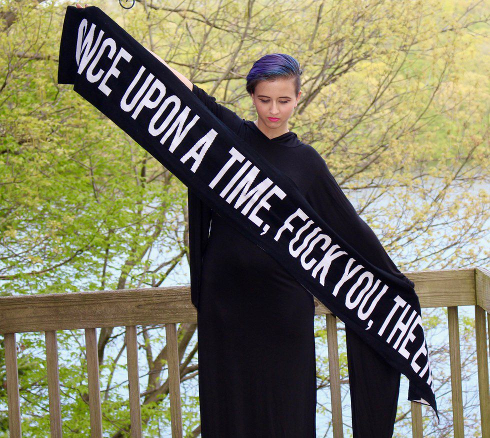 I haven't had the chance yet to wear this scarf because it's currently warm outside and I would dissolve into a puddle if I did. However, I bought it because it was on sale, the words moved me to tears and melted my gothic heart of stone. Just kidding, I won't eat your soul... yet. Back to the topic at hand, the scarf is a perfect mixture or soft and warm to wear on those chilly days when you want the world to go away.