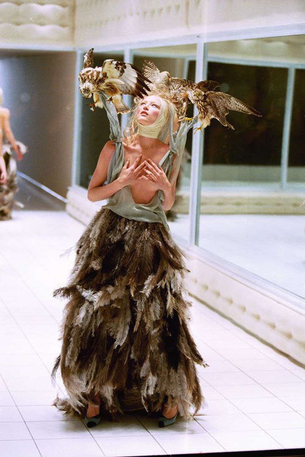 Spring/Summer 2001: “VOSS”- one of the craziest fashion shows ever. It began with a giant glass box in the center of the room bathed in light so that the audience saw only their own reflections in the glass. After an hour, the inside of the box was lit to reveal hundreds of moths and model Michelle Olley who lay naked on a chaise lounge with her face covered by a gas mask. The glass walls then dropped and shattered on the ground.