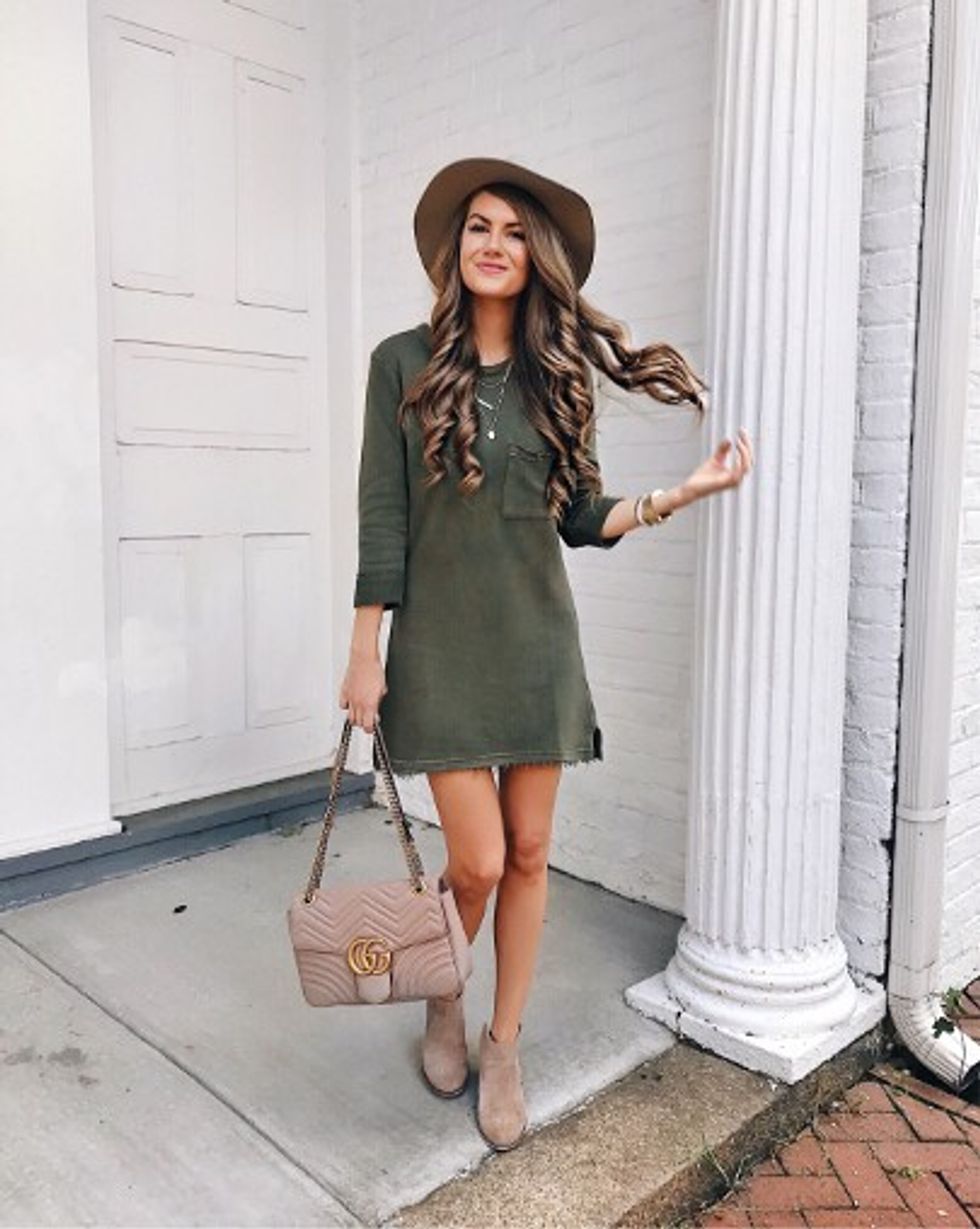 I wanted to include just a plain olive tee in this article to show that you do not have to get fancy to follow this trend. Pair a simple short or long sleeve tee in olive with your favorite short or pant and a pair of neutral booties and you're good to go! If you're still looking to style it a bit more to make it your own, consider tying it in the front or tucking it halfway in at the front to show off a cute belt. Another great option to elevate this look would be to add a neutral or print scarf!