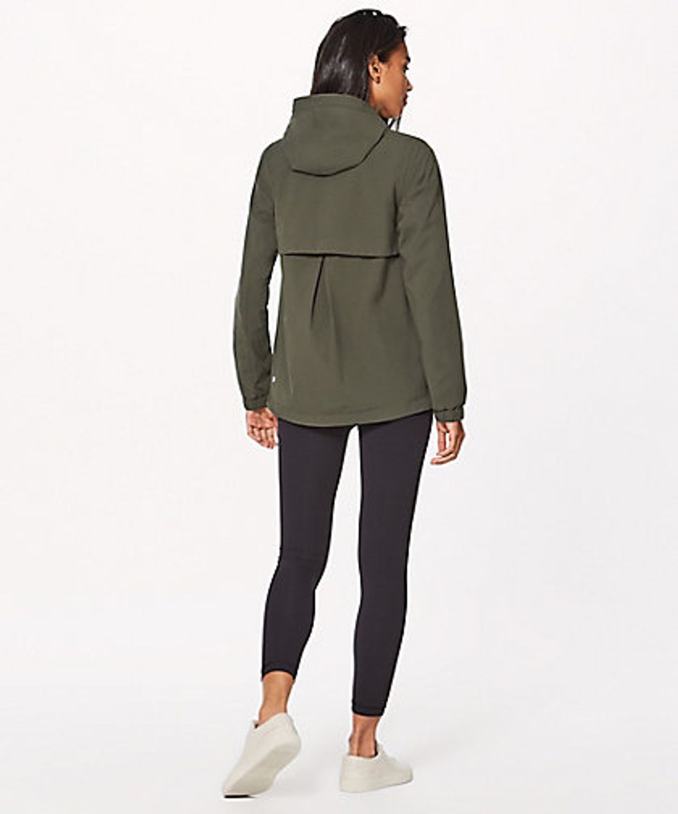 I am such a fan of the new Rise and Shine rain jacket! The cinchable hood is designed to stay put, despite the wind that often comes with rainstorms, and the pockets keep you tech-items secure and protected from the elements. The hemline also offers a cinching capability so that you can style it multiple ways.