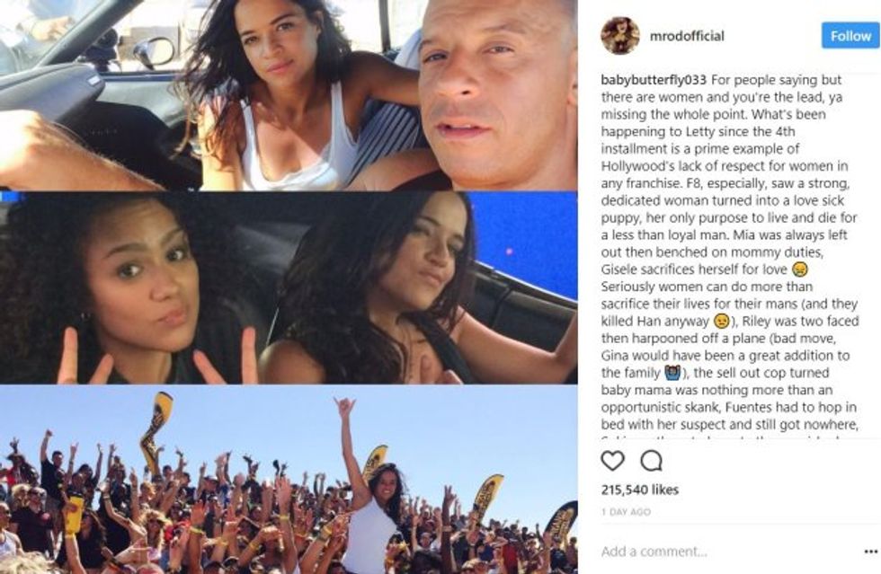 Soon after Michelle's post, Vin Deisel posted a video with Rodriguez on his Instagram page that he supports female empowerment and representation in the franchise. Rodriguez had not stated if she will or won't return for the next film but many fans expect for her character to come back.