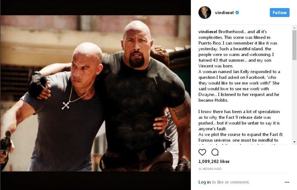 However, He later posts another throwback to Fats Five and supported The Rock as well as addressing that Fast 9 is delayed due to much-needed maintenance as the script has not been fully completed and there is still no director confirmed. This is an understanding reason to push back the movie since the story took a new shift in fast 8. Not only do we have new villain Cipher(Charlize Theron), but we also have the introduction of Dom's son, Brian Marcos Toretto, making he and Letty new parents. So I agree with the studio for taking more time to construct a new story arc for the next movie.