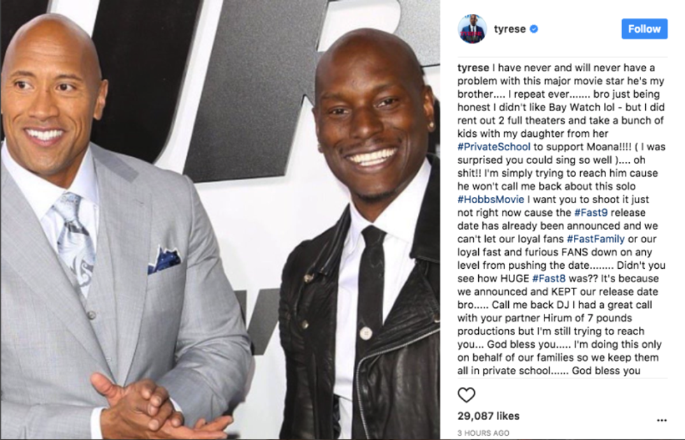 Tyrese Gibson went to Instagram pleading with The Rock to return his calls concerning the franchise. Universal Studios had been in talks of doing a Fast and Furious spin-off that would center his character, DSS Agent Luke Hobbs, and Jason Statham's character, Deckard Shaw. This is great for fans, however, that would mean that Fast and Furious 9 would be delayed and a release date had already been set for April 19th, 2019. Tyrese continued to post on Johnson's timeline try to talk about putting out the Fast movies without delaying the next movie.