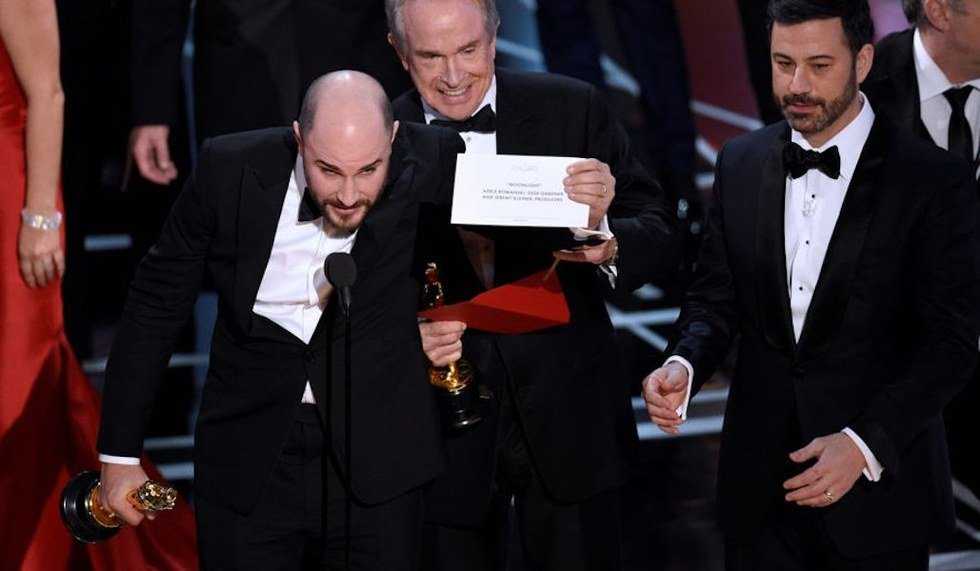 And then comes the moment everyone's been waiting for, the best picture award, and by now most of you know what happened next. For those who don't here's a quick rundown: Best Picture was presented by Warren Beatty and Faye Dunaway who were given an envelope and the card inside said: Emma Stone "La La Land." So you can understand their confusion because that's the card for Best Actress, and that award had already been announced and Emma Stone had already given her speech and collected her award. You can also understand why they thought that "La La Land" had won the award. It was a nominee and a favorite for the award after all. This is clearly not their fault. So, of course, the cast of "La La Land" swarm the stage and start giving their speeches. They're thanking their mothers and fathers and the academy.