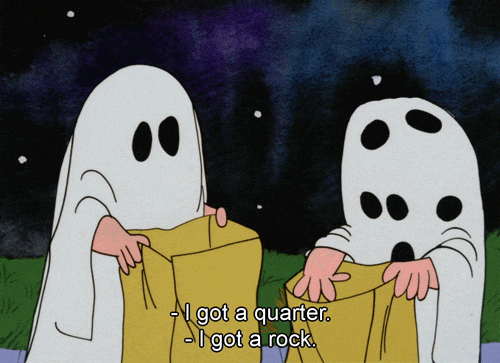 Who doesn't love some candy? There's also some other really fun stuff about Halloween like dressing up like your favorite TV/Book/Movie character or what have you. Even just the classic ghost look works, just ask our friend below, Charlie Brown.