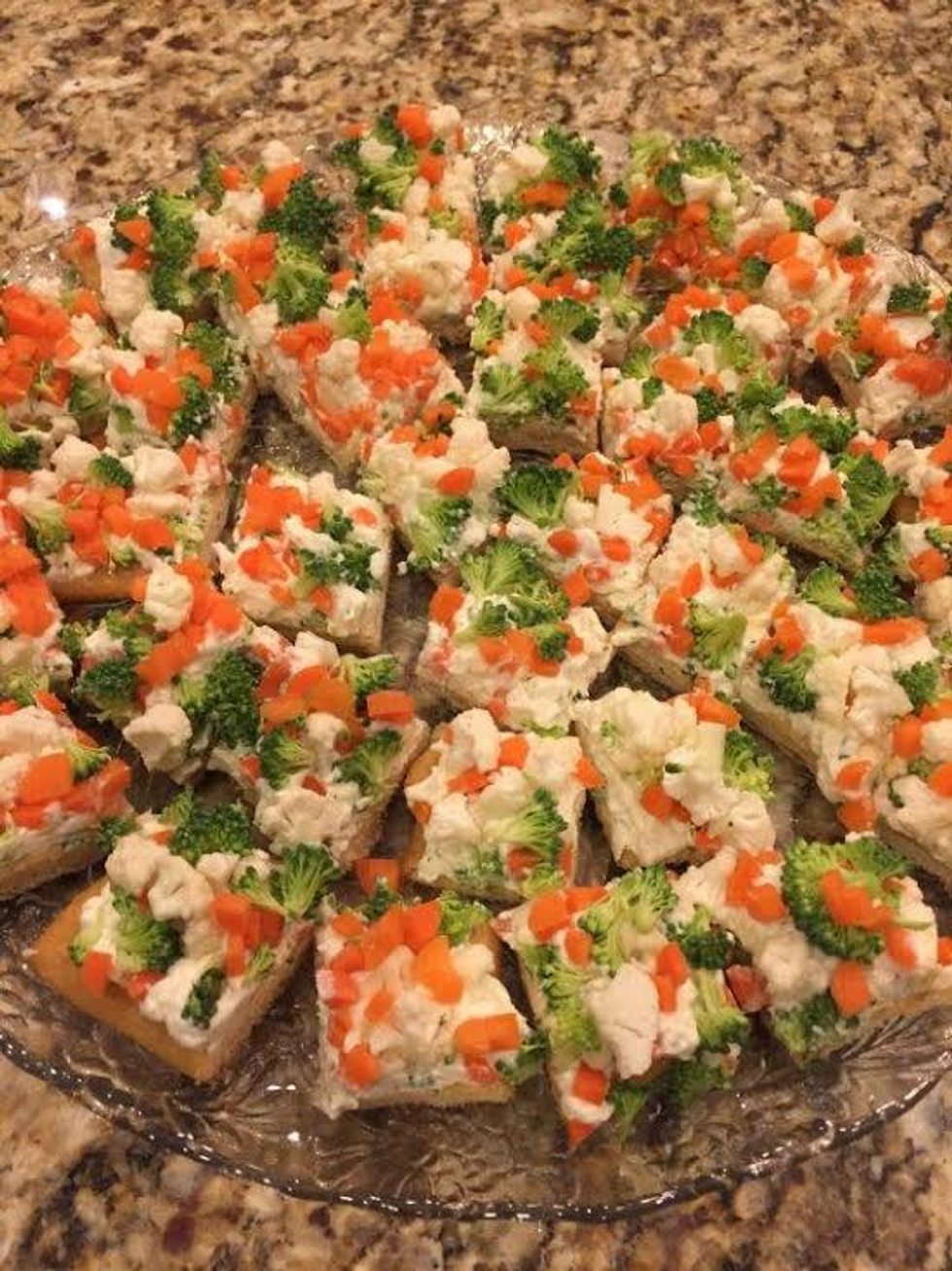 Place diced veggies over creamy spread, push lightly down on them so they stick into the spread. Cut into one-inch squares and refrigerate until ready to eat!
